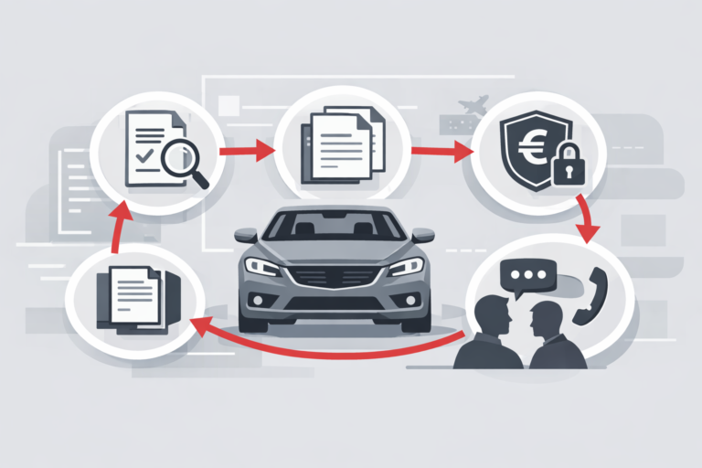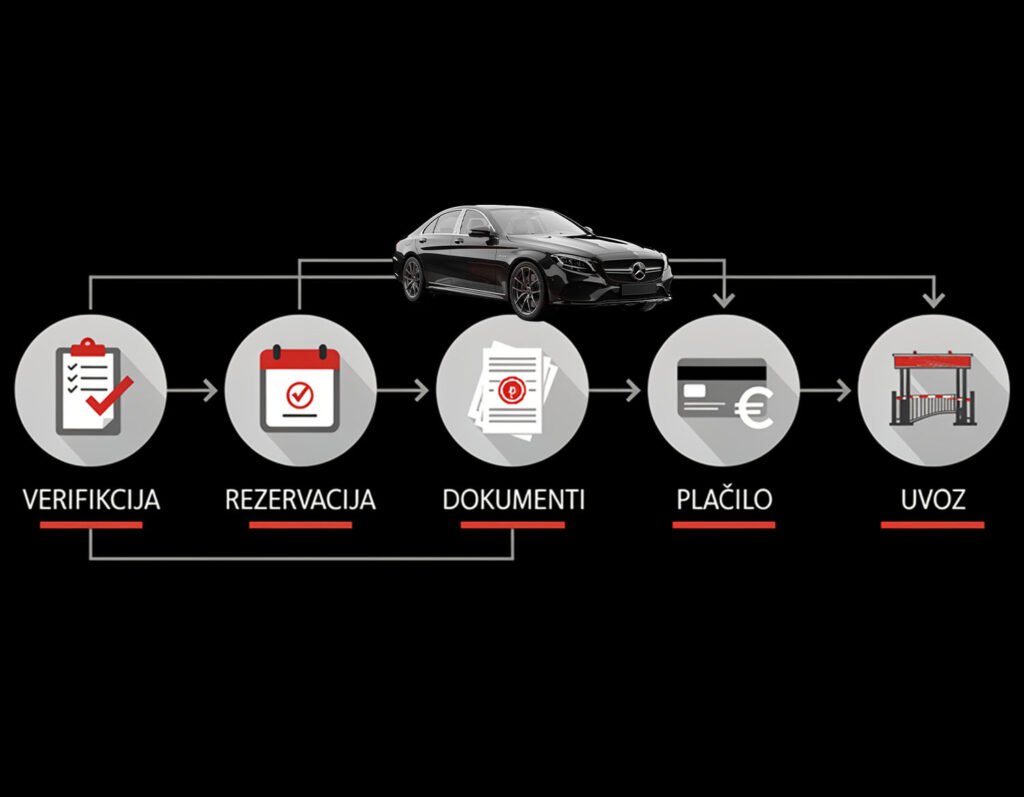 Ko je vse preverjeno, uredimo rezervacijo vozila in pripravo potrebne dokumentacije za nakup ter izvoz. Plačilo poteka izključno preko varnih, preverjenih kanalov, vi pa imate ves čas popoln vpogled v stroške in status naročila.